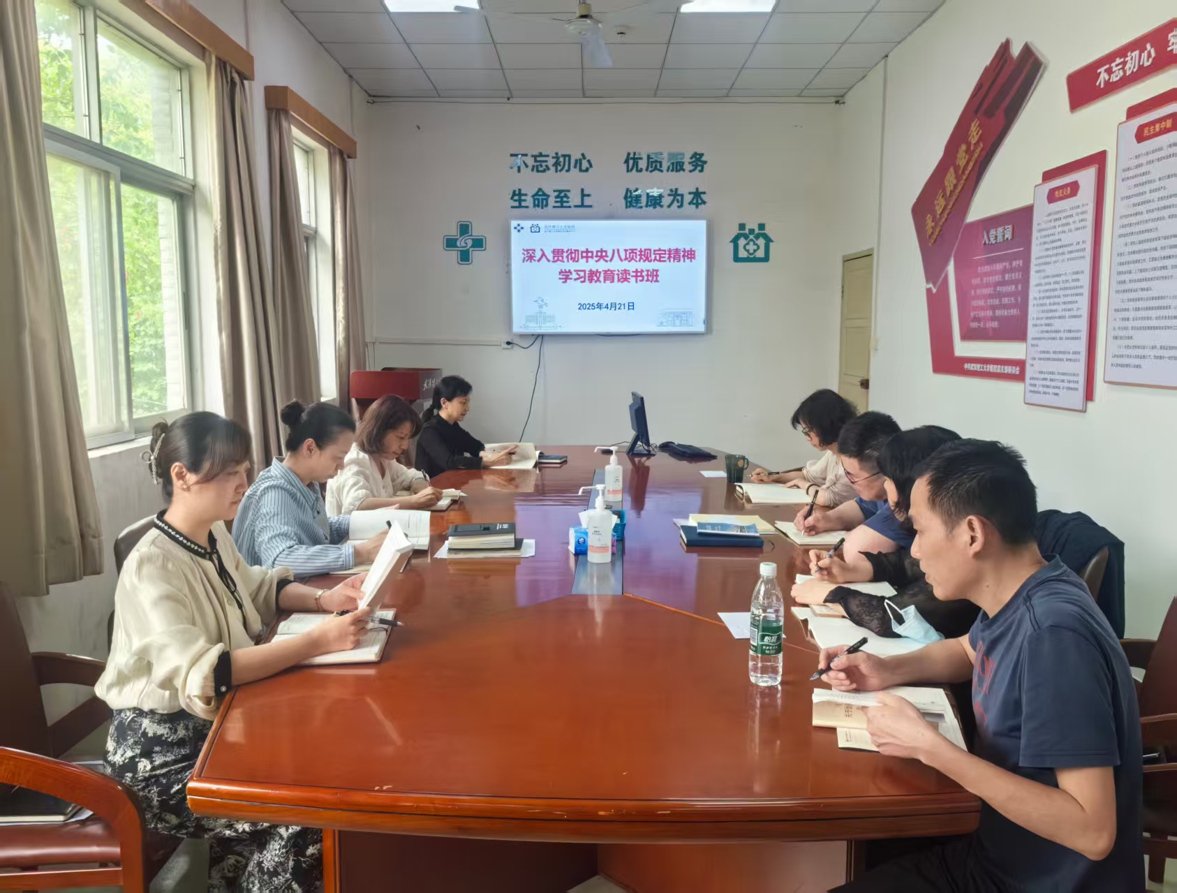 4月21日下午,医院党总支在西院四楼会议室召开了深入贯彻中央八项规定精神学习教育读书班暨党总支理论学习中心组集体学习。院领导班子成员、党总支委员参加学习,党总支书记庞艳桃主持集体学习。