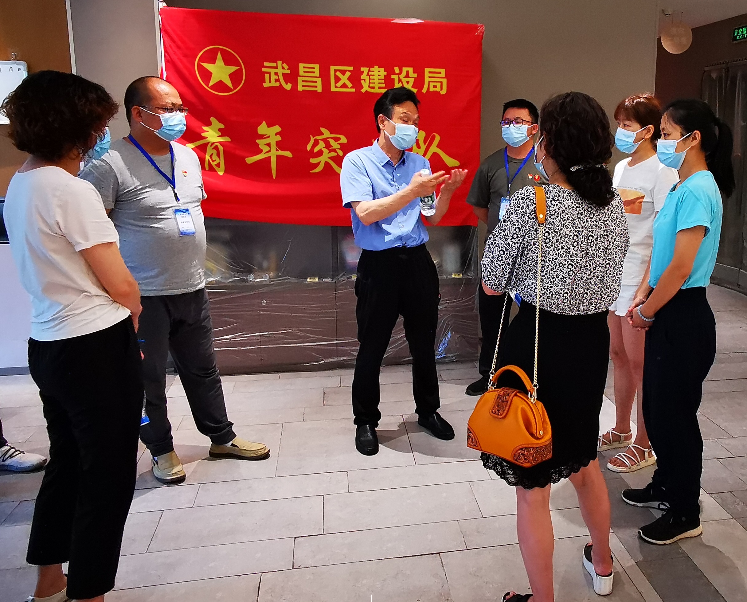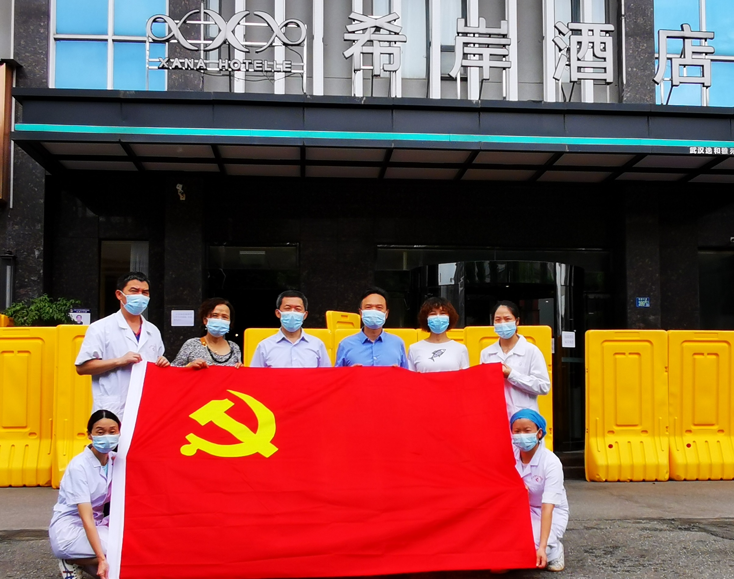 8月12日,医院党总支将一面党旗送到武昌区徐家棚街希岸酒店湖大店医学隔离点,这里的医护人员将组建临时党支部,发挥党组织力量全力开展抗疫工作。