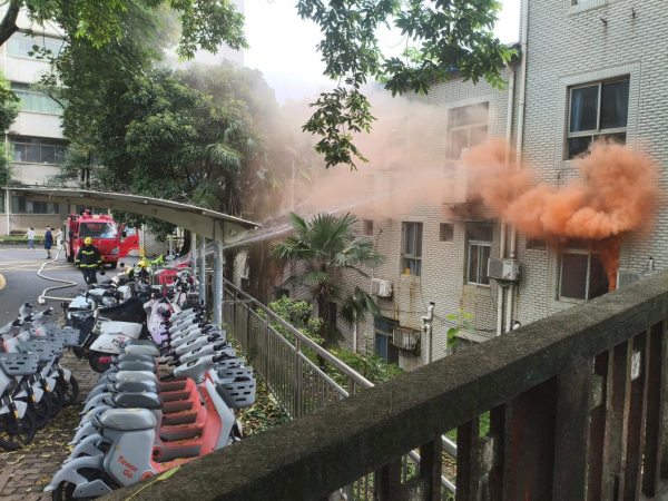灭火行动组率先响应,接到报警后迅速携带灭火器材奔赴火灾现场。面对“火情”,他们冷静判断,火势较小时果断使用灭火器扑救;当火势超出控制范围,通讯联络组同步拨打学校消防科电话与119报警求助。